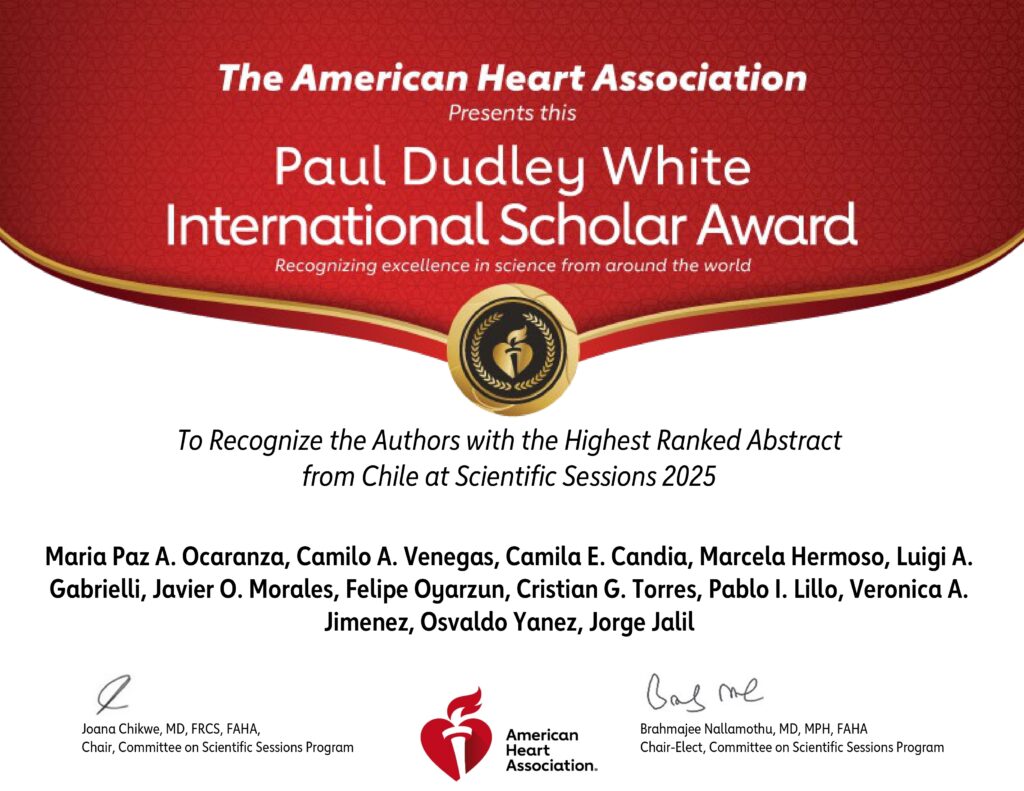 La distinción reconoce a los trabajos científicos mejor evaluados por país, destacando la excelencia científica y el aporte al conocimiento en enfermedades cardiovasculares. En esta edición, el reconocimiento fue otorgado a un equipo de investigadores chilenos encabezado por la Dra. María Paz Ocaranza, académica de la Facultad de Medicina UC y directora de CENDHY.